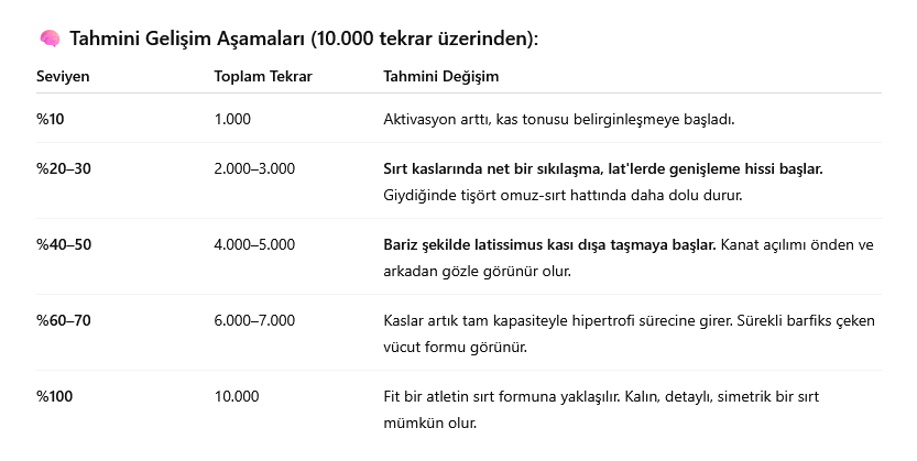 ChatGPT’yi fitness için bir kişisel asistan olarak kullanmaya başladığımda ilk yaptığım şeylerden birisi periyodik olarak vücut fotoğraflarım üzerinden kas gelişimi analizi yaptırmaktı. Bu yıl kendime bazı hedefler koydum ve vücut simetrisine önem verdiğimi de ChatGPT’ye belirttim. Biraz da uzun vadeli bir yatırım olarak sırt kaslarımı, özellikle de kanat kaslarımı geliştirme hedefi koydum. Bunu, sadece barfiks çekerek gerçekleştirmek için ne kadar süreye ihtiyacım olduğunu danıştım. Bana 6-12 ay gibi bir süre verdi. Ben bunu biraz hızlandırabileceğim düşünerek süre yerine sayı vermesini istedim ve bana 10.000 rakamını verdi.
