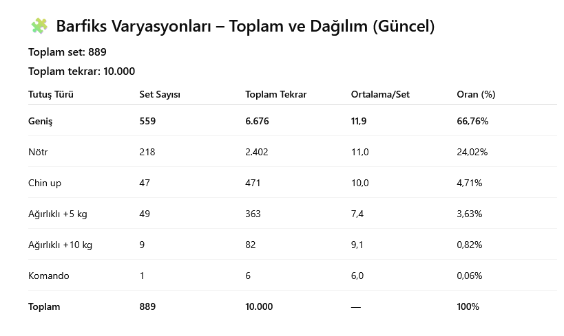 Yapay zekâya haftalık setleri, barfiks varyasyonları ve toplam ilerleme durumunu gösteren tablo ve grafikler yaptırdım. Her yeni veri verdiğimde bu formata göre yeniden listeleniyordu. Bu gösterimler ve veri takibi motivasyonumu yüksek tutmamda faydalı oldu.