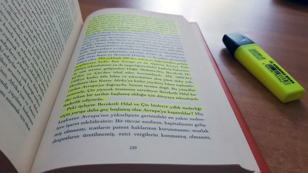 Eğer bir kitapta epeyce bir işaretleme yapmışsam o kitap benim için dolu dolu bir içeriğe sahip demektir. Örneğin Medeniyetler Çatışması ve Tüfek, Mikrop ve Çelik kitaplarımın çoğu fosforlu kalem işaretlemeleri ile doludur. Böyle kitapların içeriğinde işaretlediğim kısımları bir word dosyasında toparlayıp, derleyerek kendim için bir kitap özeti PDF’i oluşturuyorum. Böylece, 600-700 sayfalık bir kitabın en vurucu kısımlarını ihtiyaç duymam halinde 15-20 sayfalık bir özetle hızlıca anımsayabiliyorum.